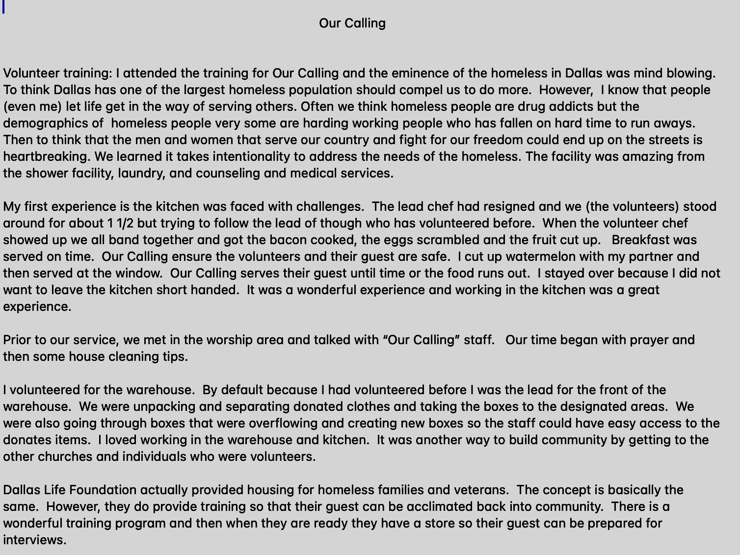 For my competence in cultural engagement, I am submitting selfies of myself during my volunteer training at “Our Calling.” Also, selfies of me serving in the kitchen at “Our Calling” and the warehouse at “Dallas Life Foundation.” Not pictured is when I served in the warehouse at “Our Calling.” I learned there are over 10,000 homeless people in Dallas. It reminded me of an article I wrote several years ago (see below). It was a reminder that it is time to stop living in a vacuum and be conscious of the community around us. I learned volunteering is a selfless act. When everyone was sleeping on Saturdays, it took everything within me to get up and move. I can genuinely say I never regretted the hours I invested. Both organizations’ goals are to improve the lives of others, and the gift of time makes someone else’s life better.